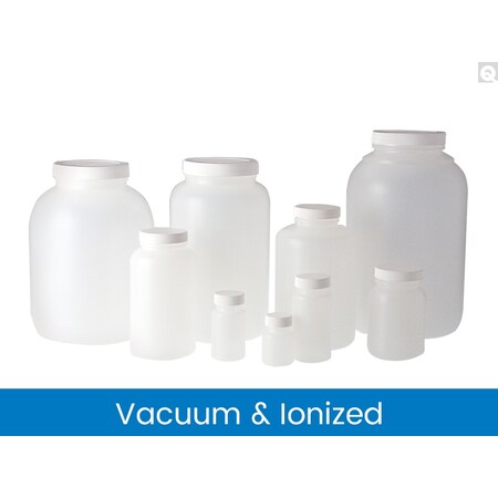 These <STRONG>pre-cleaned wide mouth plastic bottles</STRONG> feature a HDPE (high-density polyethylene) construction, round shape, and are cleaned by Qorpak’s cost effective vacuum and ionization process. <P><STRONG><BR>V & I Bottle Cleaning Process:</STRONG></P> Compressed air passes through a condensate separator and coalescing filter to remove aerosols and fine dust particles. <BR> Next, the air passes through an absorbent filter to remove gases. <BR> A vacuum draws the particulate-laden atmosphere out of the bottle. <BR> Individually cleaned closures are immediately placed on the bottle.<BR> <P><STRONG>Benefits of Qorpak V & I Pre Cleaned Bottles:</STRONG></P> Extremely cost-effective.<BR> Saves time! No need to waste valuable time rewashing bottles.<BR> Provides a clean final appearance. You will not find any dust particles floating in your samples. <BR> Each bottle is individually cleaned, they will not collect dust, flies, and other debris while stored in your lab. <BR> Odor-free and tasteless. The air inside the pre-cleaned bottle will not interfere with your product in any way. <BR>