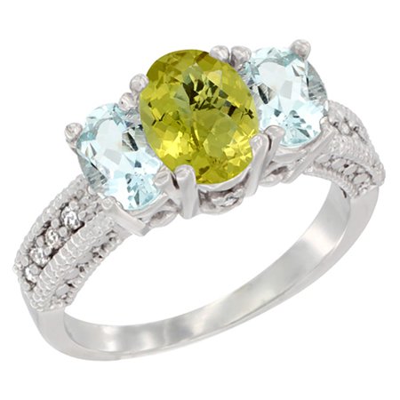 10K White Gold Diamond Natural Lemon Quartz Ring Oval 3-stone with Aquamarine, sizes 5 - 10