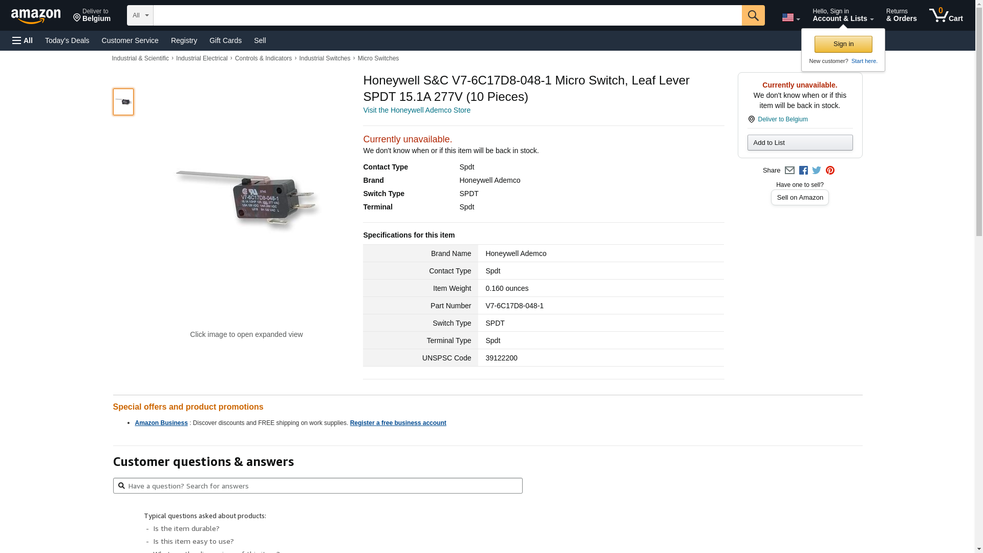 Honeywell S&C V7-6C17D8-048-1 Micro Switch, Leaf Lever SPDT 15.1A 277V (10 Pieces)