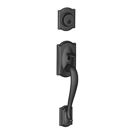 Schlage F92-CAM-622 Matte Black Camelot Dummy Handleset (Exterior Side Only) Applications: Residential locks single and multi-family entrance doors - For use as door pull or as dummy trim on inactive leaf or pair of doors. - Fixed thumbpiece and inside knob/lever. - Dummy cylinder with inside plate.