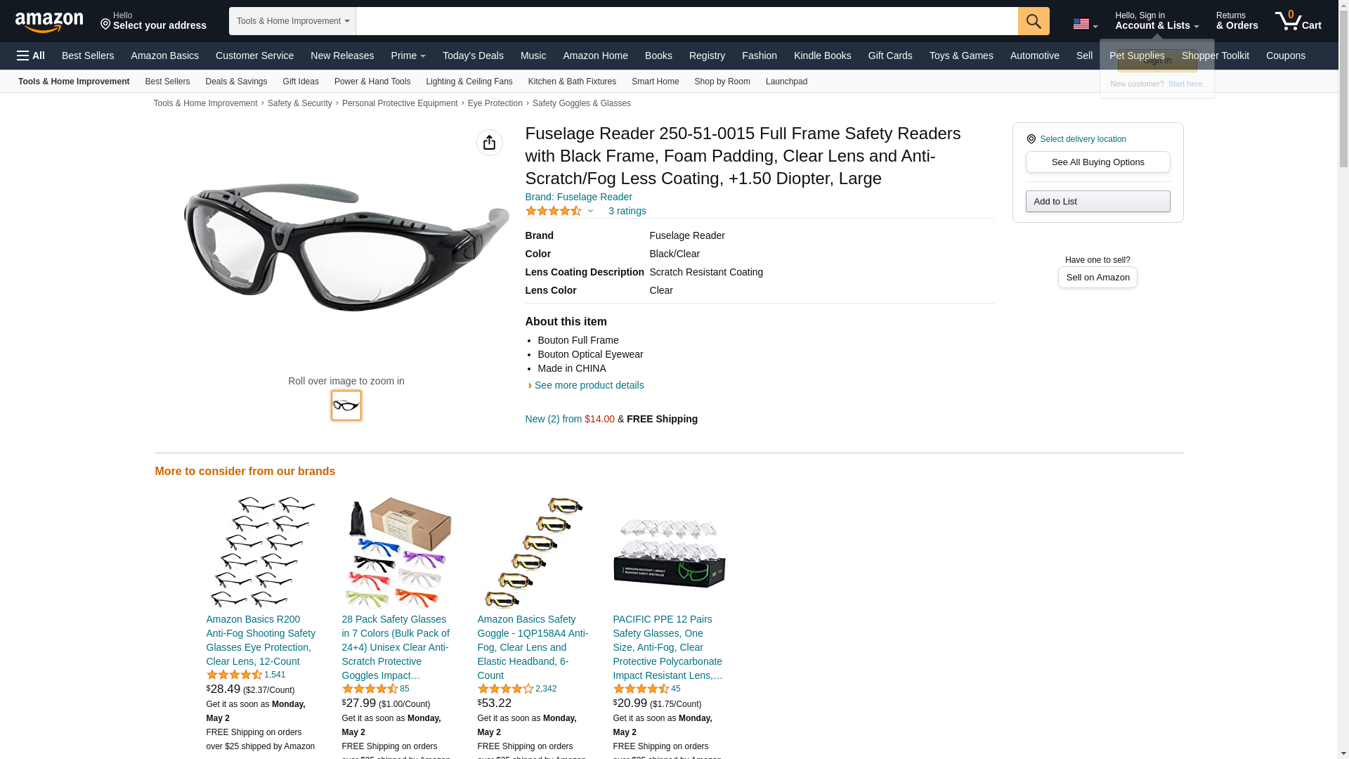Fuselage Reader 250-51-0015 Full Frame Safety Readers with Black Frame, Foam Padding, Clear Lens and Anti-Scratch/Fog Less Coating, +1.50 Diopter, Large