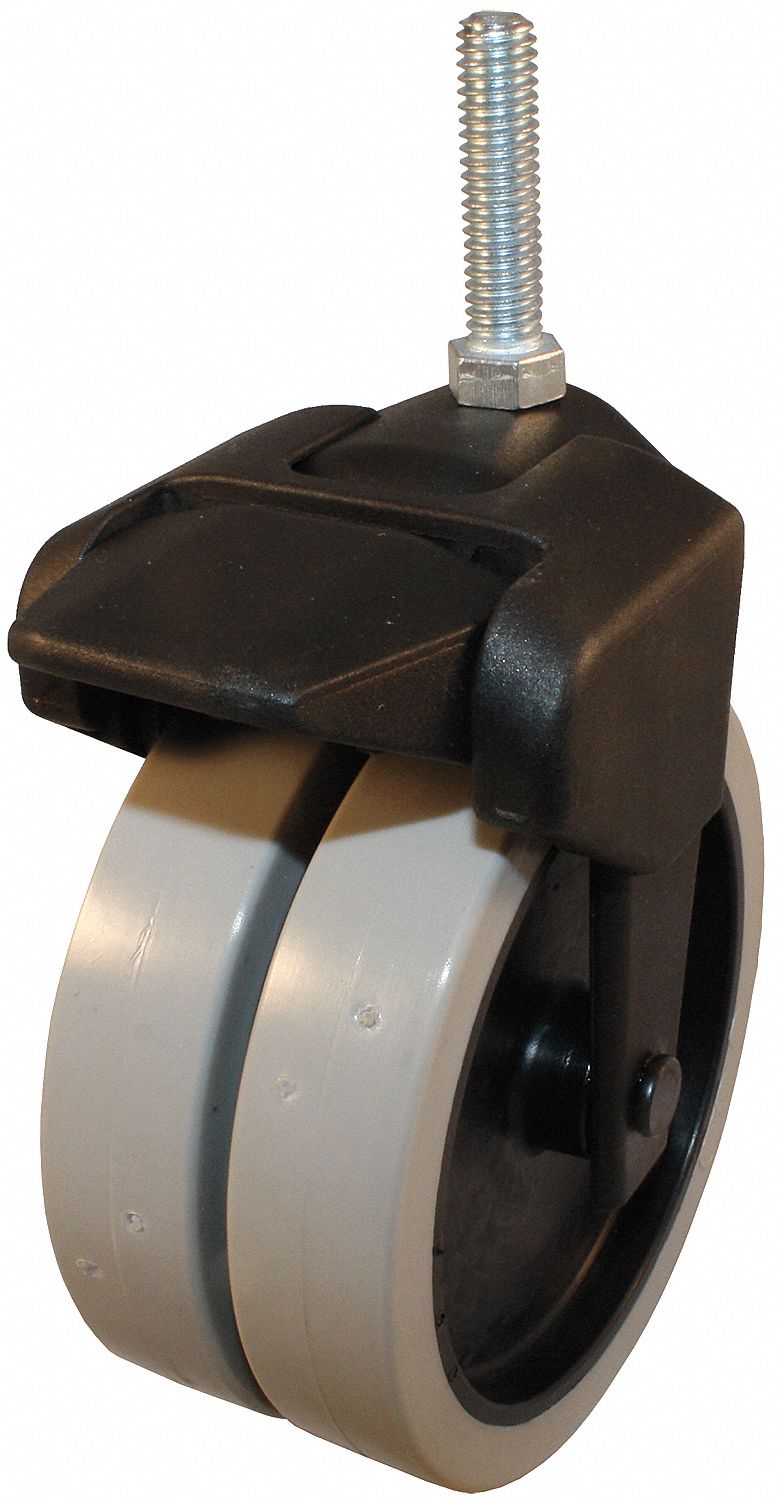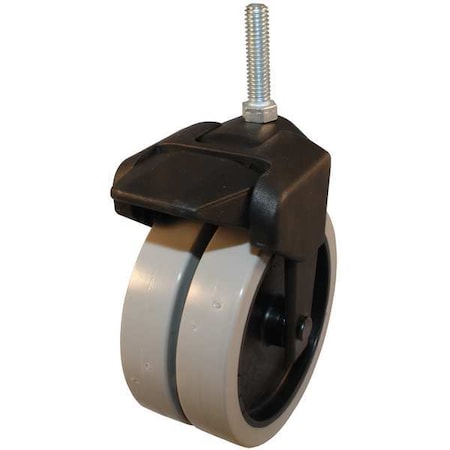 4" DUAL WHEEL BLACK COMPOSITE DISPLAY CASTER BODY <br> TWO 4" X 3/4" GREY TPR WHEELS ON BLACK PP CORE <br> 3/8-16 X 1-1/2" THREADED STEM <br> 1/2" HEX NUT AT BASE WITH TREAD BRAKE