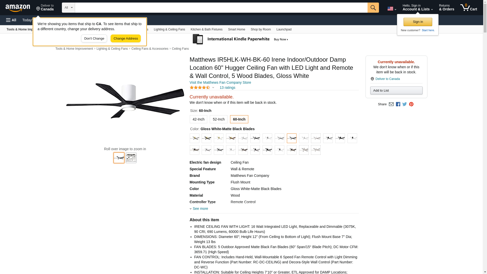 Buy Matthews Fan IR5HLK-WH-BK-60 60-in 31W Irene Ceiling Fan w/ LED Light Kit, DC, 6-Speed, 5-Black Blades, White on HomElectrical.com. Take advantage of FREE SHIPPING.