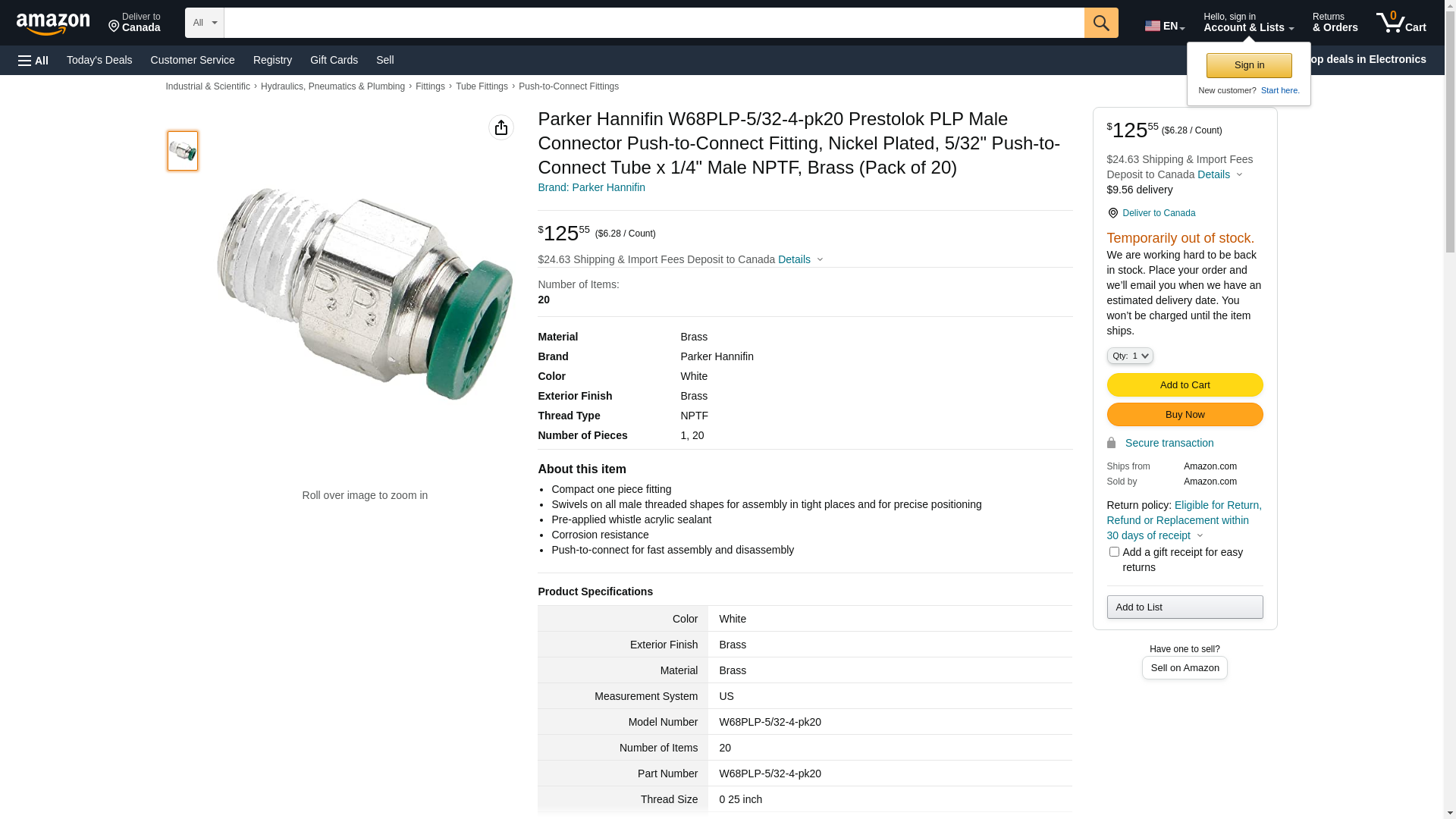 | Feature | Price For: Each Basic Fitting Material: Metal Basic Fitting Shape: Adapter Item: Male Connector Specific Fitting Shape: Connector Hex Size: 9/16" Temp. Range: 0 Degrees to 200 Degrees F Tube Fitting Material: Nickel Plated Brass Fitting Connection Type: Tube x MNPT Pipe Size (Fittings): 1/4" Max. Pressure: 300 psi Tube Size: 5/32" Country of Origin (subject to change): Unknown |