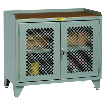 MHP3-LL-2D-2448 Features: -Heavy duty leg levelers adjust for up to 3" of additional height. -Clearview doors feature a keyed handle and 3 point latching mechanism. -Top work surface material: 0.25" hardboard. -All-welded 12 gauge construction. -Made in the USA. -Product Type: Mobile Bench Cabinet. Finish: -Gray. Shelves Included: -Yes. Country of Manufacture: -United States. Cabinets Included: -Yes. Top Material: -Wood. Frame Material: -Metal. Dimensions: -The top work surface: 41" H x 24" D x 48" D and is surrounded by retaining lip on three sides . Overall Height - Top to Bottom: -42.5". Overall Width - Side to Side: -48". Overall Depth - Front to Back: -26". Overall Product Weight: -302 lbs.