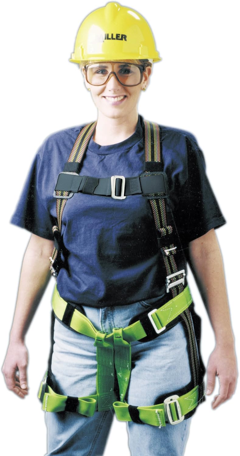 This DuraFlex Ms. Miller harness with elastomer webbing includes friction buckle shoulders, mating buckle chest and leg straps, sliding back D-ring. Also includes side Dee rings, back pad, leg pads and lanyard ring. Permanently attached to lanyard or tag. Available in small/medium size. Measures 11-Inch length by 6-Inch width by 4-Inch height.