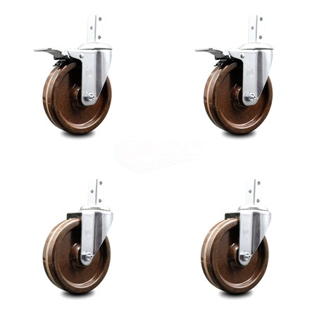 Swivel Square Stem Caster Set 4 w/5” x 1.25” Brown High Temp Phenolic Wheel - 3/4” x 2” Square Stem with (3) 17/64” Diameter Mounting Holes - Includes 2 Total Lock Brakes - Service Caster Brand