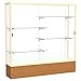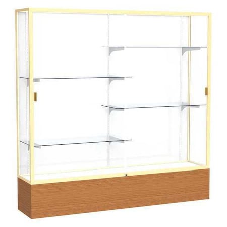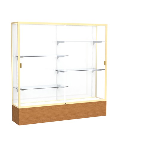 2076WB-GD-MK Backing: White, Frame Finish: Gold, Wood Finish: Carmel Features: -Aluminum framed case. -Sliding tempered glass doors for safety and convenient access to materials. -Built in lock for security. -4 Half length adjustable shelves. -Oak veneered base. -Reflective mirror back adds luster and class. Product Type: -Trophy display case. Style: -Floor standing. Display Material: -Glass. Country of Manufacture: -United States. Frame Material: -Metal. Adjustable Shelves: -Yes. Dimensions: Overall Height - Top to Bottom: -72". Overall Width - Side to Side: -72". Overall Depth - Front to Back: -16". Overall Product Weight: -546 lbs.