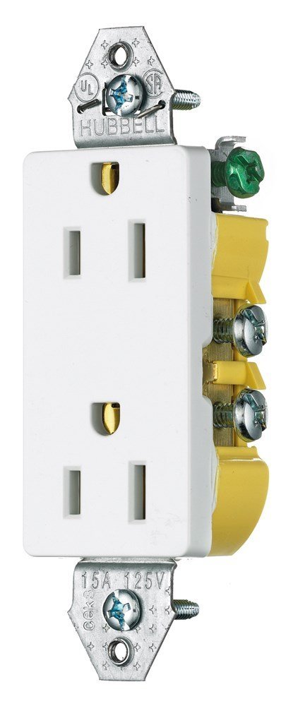 Hubbell RRD15KW, TradeSelect, Straight Blade, Decorator Duplex Receptacle, Less Ears, 15A 125V, 2-Pole 3-Wire Grounding, 5-15R,White.