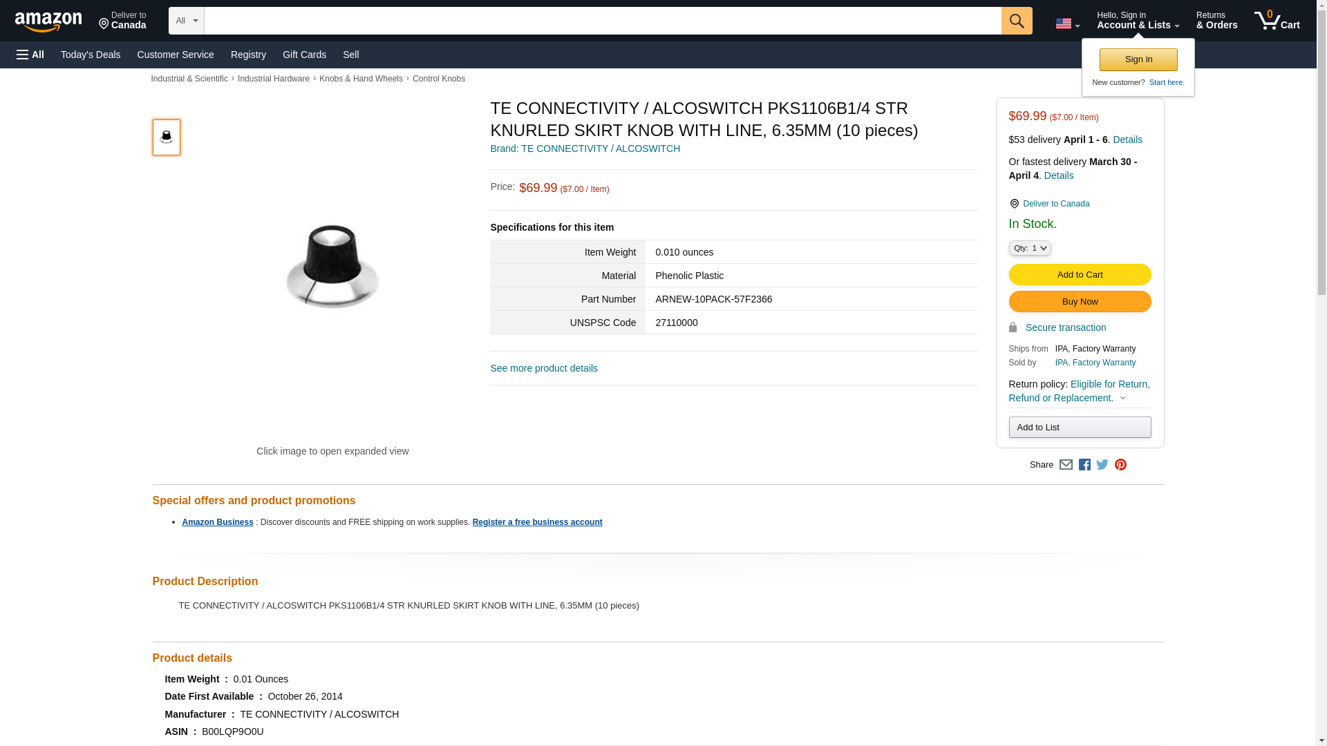 TE Connectivity / Alcoswitch Brand PKS1106B1/4 Switch Accessories