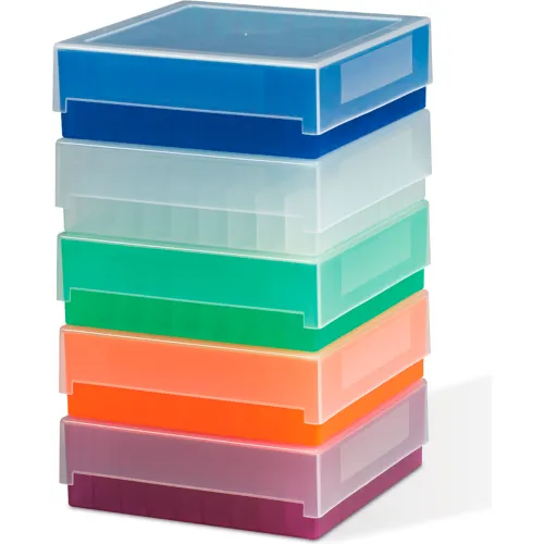 Polypropylene storage boxes provide compact storage and keep cryo vials organized on the bench, in the freezer, or during transport. -Polypropylene construction -Impervious to moisture and heavy use -Color-coded for quick visual identification -Alphanumeric grid for tracking individual samples Useful at temperatures 80C to +121C (-112F to +249F), these 81-place, 9 x 9 row boxes hold 0.5, 1.5 and 2.0 mL tubes and cryo vials Five color choices are useful for organization and quick visual identification of samples. Secure fitting, lift-off, clear translucent lids let you easily view contents and have matte panels on two sides for trouble-free labeling. An alphanumeric grid lets you track individual samples. No slide features molded in bottom and lid provide secure stacking. Unlike cardboard models, these sturdy boxes will not break down with exposure to moisture and heavy use.