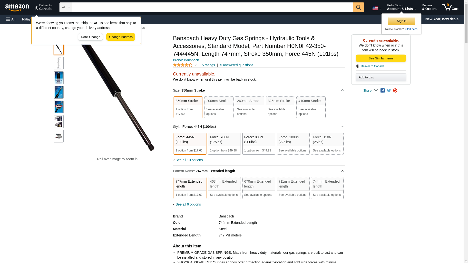 Bansbach Heavy Duty Gas Springs - Hydraulic Tools & Accessories, Standard Model, Part Number H0N0F42-350-747/445N, Length 747mm, Stroke 350mm, Force 445N (101lbs)