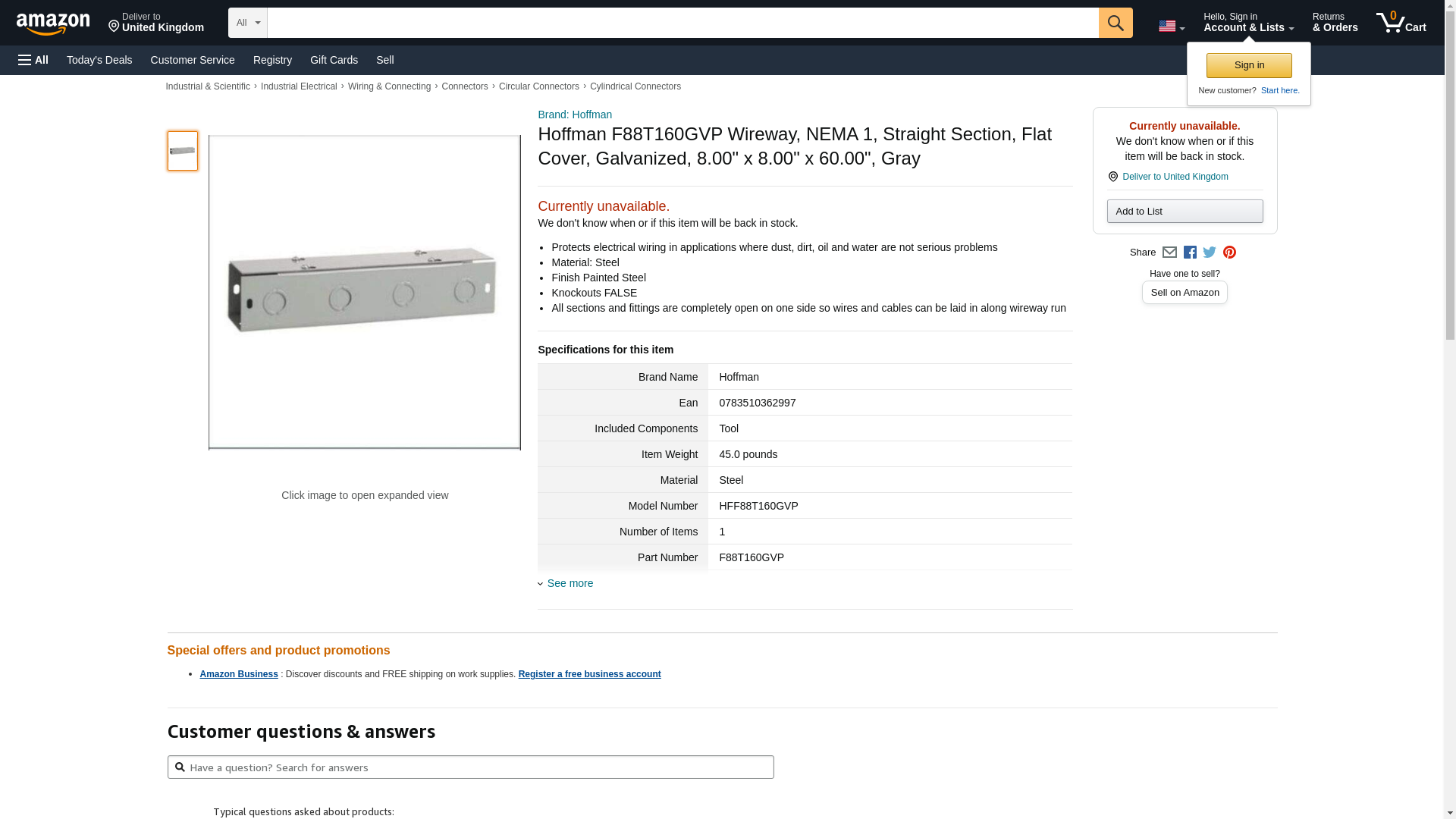 Hoffman F88T160GVP Wireway, NEMA 1, Straight Section, Flat Cover, Galvanized, 8.00" x 8.00" x 60.00", Gray