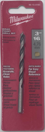 For drilling the most accurate and clean holes in wood and plywood, choose the Milwaukee 3/16 in. brad point bit. Milwaukee brad point bits start holes with precision and finish without splinters. The machined tips maintain a sharp cutting edge for longer life on the job. The bits feature 1/4 in. depth marks for easy visual reference during drilling.; ; Brand Name: Milwaukee Drill Size: 3/16 in. Overall Length: 3-1/2 in. Material: High Speed Steel Style: Brad Point Product Type: Drill Bit Number in Package: 1 pc Packaging Type: Carded Shank Type: Round Shank Shank Diameter: 3/8 in. Finish: Polished Bit starts holes with precision and finishes without splinters Features 1/4 in. depth marks for easy visual reference during drilling Precision-ground tip maintains sharp cutting edge