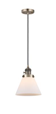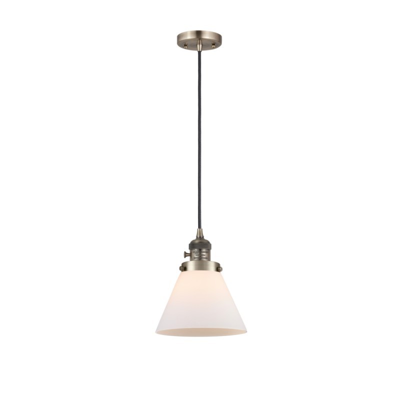 INNOVATIONS 201CSW-AB-G41-LED 1-Light Mini Pendant Antique Brass. Collection: Franklin Restoration. Style: Industrial, Farmhouse, Restoration-Vintage, Transitional. Metal Finish: Antique Brass. Metal Finish (Canopy/Backplate): Antique Brass. Material: Steel, Cast Brass, Glass. Dimension(in): 10(H) x 8(W) x 8(Dia). Min/Max Height (Fixture Height with Cord or Included Stems & Canopy)(in): 13.25/131.25. Wire/Cord: 10 Feet Of Black Textured Cord. Bulb: (1)6W Medium Base,Dimmable(Not Included). Maximum Wattage Per Socket: 100. Voltage: 120. Color Temperature (Kelvin): 2700. CRI: 82. Lumens: 600. Glass Shade Description: Matte White Cased Large Cone. Glass or Metal Shade Color: Matte White. Shade Material: Glass. Glass Type: Frosted. Shade Shape: Cone. Shade Dimension(in): 7.75(W) x 6(H). Fitter Measurement (Glass Or Metal Shade Fitter Size): 3.25 inch Fitter. Canopy Dimension(in): 4.5(Dia) x 0.75(H). Sloped Ceiling Compatible: Yes. California Proposition 65 Warning Required: Yes. UL & ETL Certification: Damp Location.