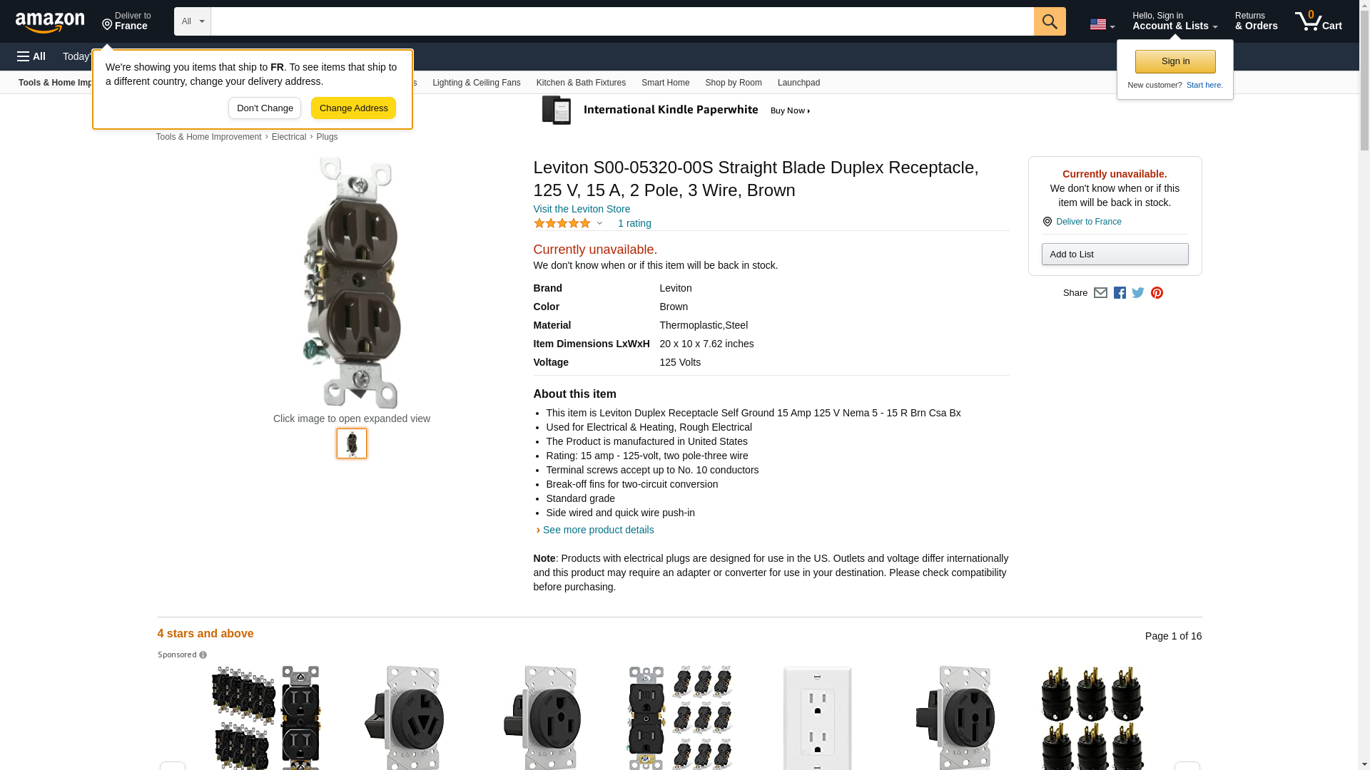 Sold as 23 UNITS at $1.12 per unit. (1 unit = each.) 15 amp. 125 volt. NEMA 5-15R. 2P, 3W. Straight blade. With ears duplex receptacle. Residential grade. Thermoplastic body material. Self grounding. Quickwire Push-in and side wired. Steel strap. Boxed. Brown . Manufacturer number: S00-05320-00S. SKU #: 3172277. Country of origin: (TBA). Distributed by Leviton Mfg. Co.,, Inc.
