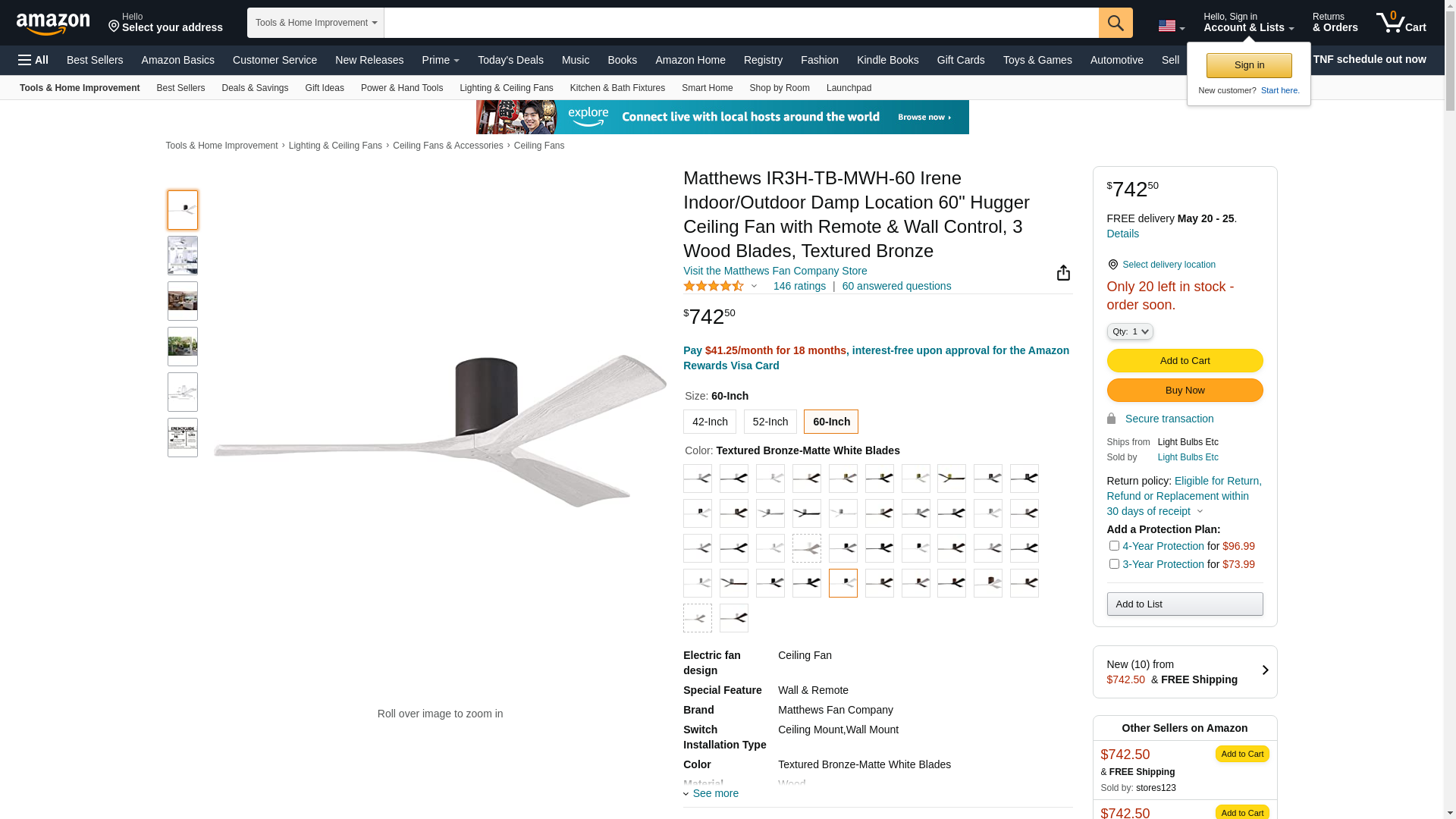 Buy Matthews Fan IR3H-TB-MWH-60 60-in 32W Irene Ceiling Fan, DC, 6-Speed, 3-White Blades, Bronze on HomElectrical.com. Take advantage of FREE SHIPPING.