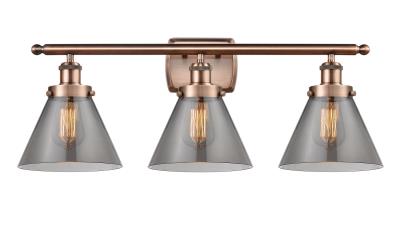 INNOVATIONS LIGHTING 916-3W-AC-G43-LED BALLSTON LARGE CONE 3 LIGHT 26 INCH PLATED SMOKE GLASS VANITY LIGHT, ANTIQUE...