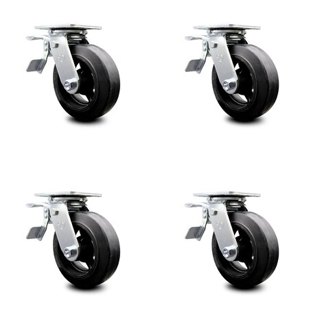 Rubber on Cast Iron Swivel Caster w/Main. Free Bearings Set of 4 w/6" x 2" Black Wheels - Includes 4 Swivel w/Total Lock Brakes - 1800 lbs Total Capacity - Service Caster Brand