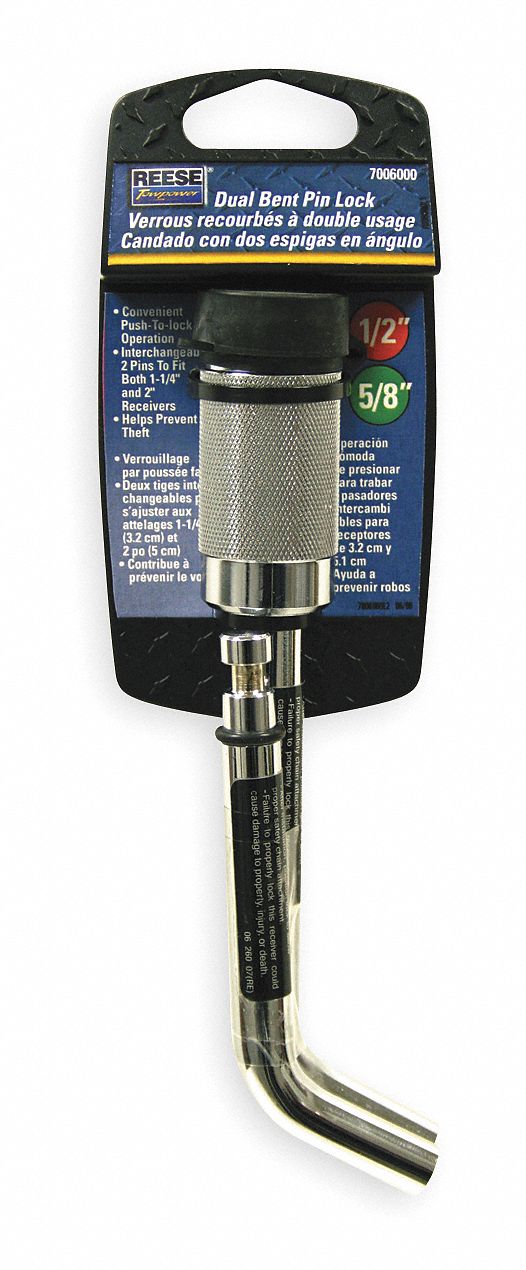 | Feature | <b>Price For:</b> Each <b>Item</b>: Receiver Lock <b>Finish</b>: Chrome Plated Over Steel <b>Hole Dia.</b>: 1/2" or 5/8" <b>Lock Type</b>: Dual Bent Pin <b>Includes</b>: Rubber Cap <b>Features</b>: Push-Button Lock Mechanism, Flat Key Design <b>Class</b>: I, II, III, IV <b>Country of Origin (subject to change)</b>: China |