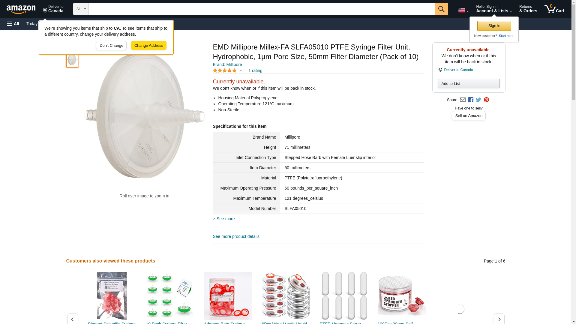 EMD Millipore Millex-FA SLFA05010 PTFE Syringe Filter Unit, Hydrophobic, 1µm Pore Size, 50mm Filter Diameter (Pack of 10)