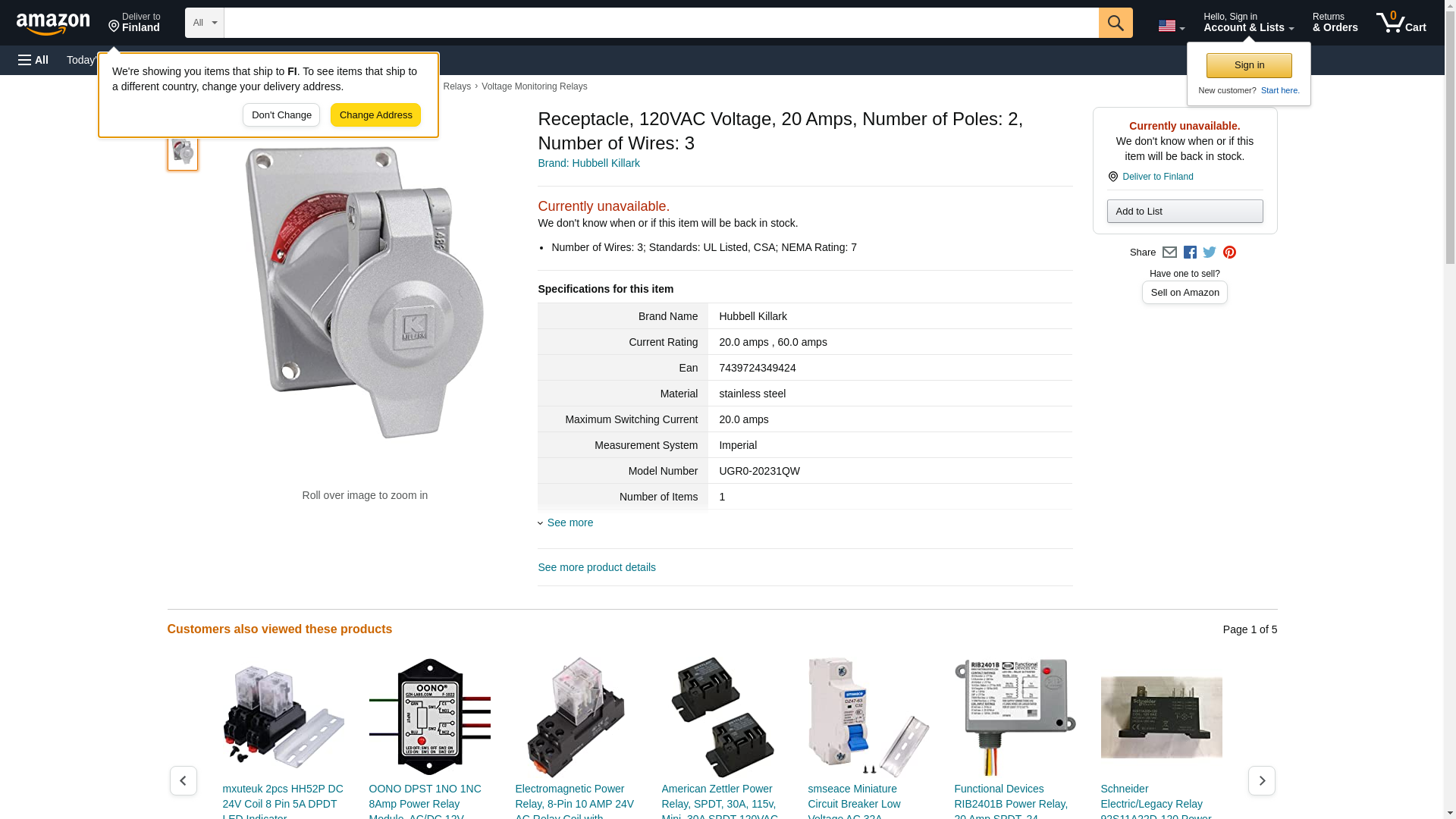 Receptacle, 120VAC Voltage, 20 Amps, Number of Poles: 2, Number of Wires: 3