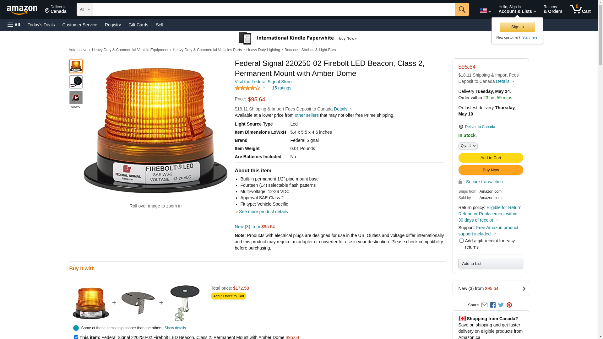 Federal Signal 220250-02 Firebolt LED Beacon, Class 2, Permanent Mount with Amber Dome
