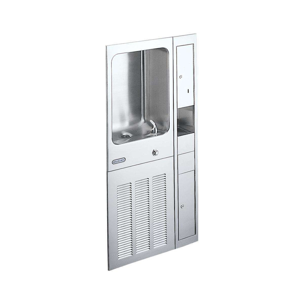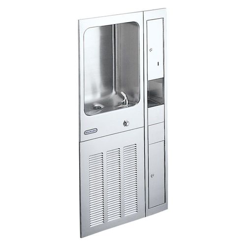 Product Features: Covered under Elkay's 5 year limited warranty on any refrigeration systems or 12 month limited warranty for electrical/water system components Single station drinking fountain with self contained cooler Electric refrigeration is a combination tube-tank running single phase Capacity of 50℉ drinking water, based upon 80℉ inlet water and 90℉ ambient A cleanable strainer screen is provided to trap waterborne particulate of 140 microns or bigger prior to entering the cooler Cup dispenser holds 100 4 oz. cups and water dispenser is push back self closing type Front Push-button control for faucet activation Valve with built-in flow regulator to provide constant stream from 20 to 105 psi water pressure Construction: #16 gauge, 304 series nickel bearing stainless steel basin polished to a lustrous satin finish Contoured basin offers large area to minimize splashing when in use Flex-Guard bubbler® utilizes pliable polyester elastomer to prevent accidental mouth injury. Flexes on impact and returns to original position Stainless Steel Basin - One piece basin has integral drain grid, embossed bubbler pad. No exposed fasteners Cabinet design allows for flush to wall mounting. No recess space is required Cooling System: Motor Compressor - Hermetically sealed, reciprocating type, single phase. Sealed in lifetime oil supply. Equipped with electric cord and three prong molded rubber plug Condenser - Fan cooled, copper tube with aluminum fins. Fan motor is permanently lubricated Cooling Unit - Combination tube-tank type. Tube portion is continuous coil of copper tubing. Fully insulated with EPS foam (UL listed for self-extinguishing material) Refrigerant Control - Refrigerant type HFC-134a is controlled by accurately calibrated capillary tube for positively trouble free performance Temperature Control - Enclosed adjustable thermostat is factory preset
