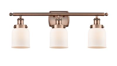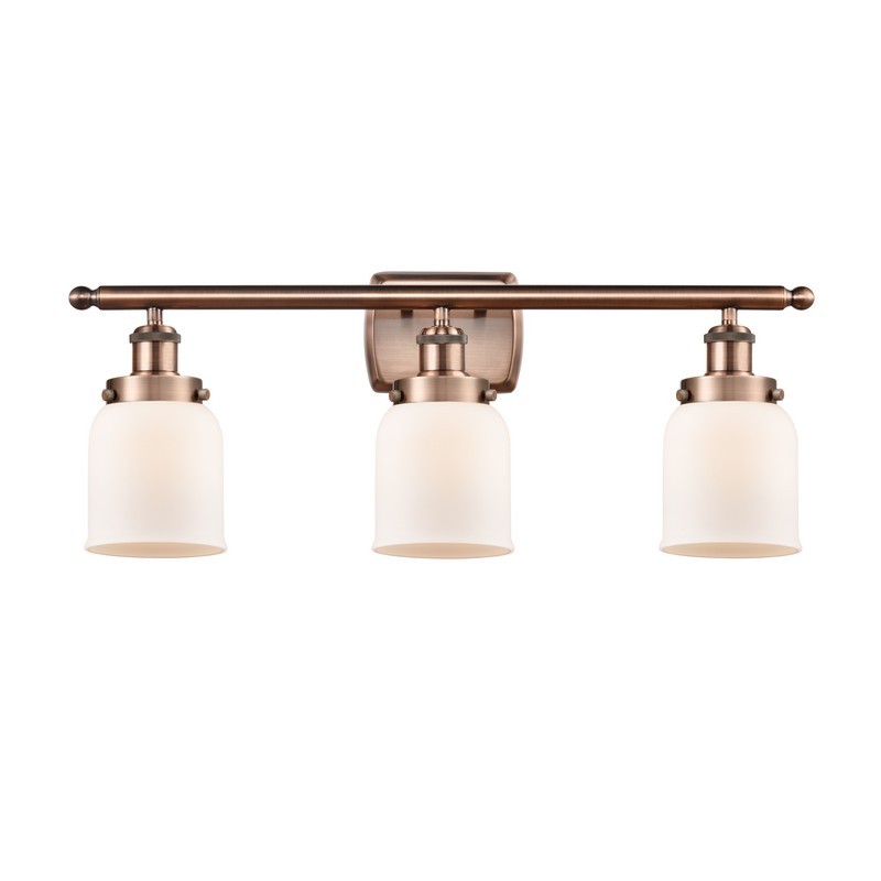 916-3W-AC-G51 Industrial, Modern Contempo, Restoration-Vintage, Transitional Style Ballston Collection 3 Light Indoor Bath Vanity Light In Antique Copper Finish With Bell Shaped Matte White Glass Shade. Rated For: Damp Location. Light Bulb Data: 3 Incandescent, Medium Base 60 Watt. Bulb Included: No. Dimmable: Yes.