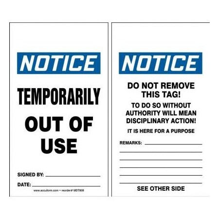 Order MDT808PTM by Accuform RP-Plastic Tag "Temporarily Out of Use" - US Mega Store