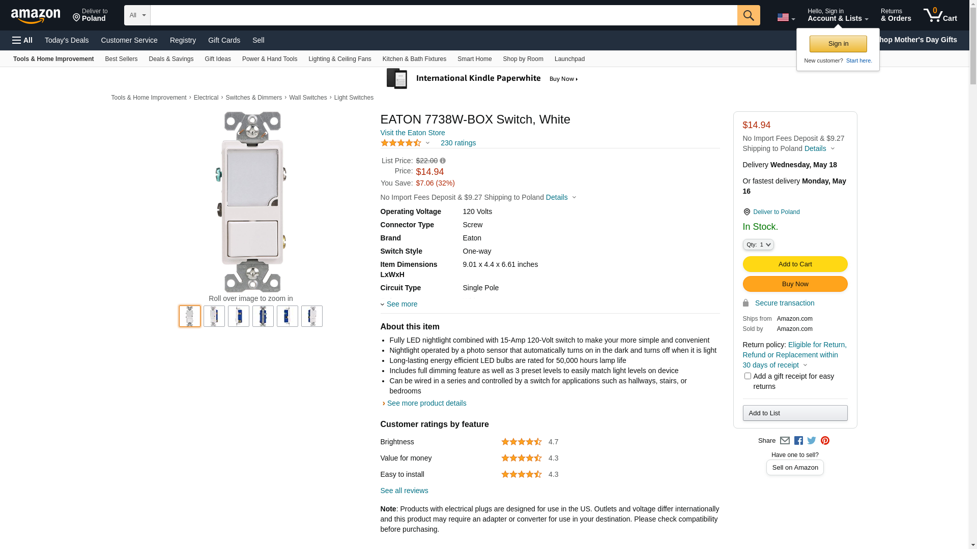 | 7738W-K-L | 1 | Cooper Wiring Orders Over $150 Usually Ship NextDay, Otherwise5-7 Days | 1 | 1 @ $23.59 | |