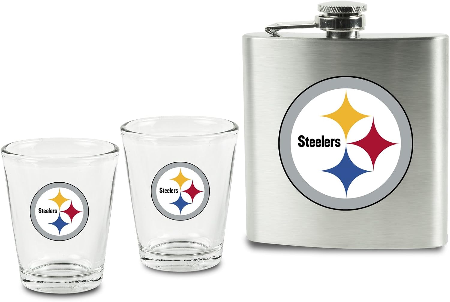 NFL Pittsburgh Steelers Shot Glasses and Brushed Stainless Steel Flask Set