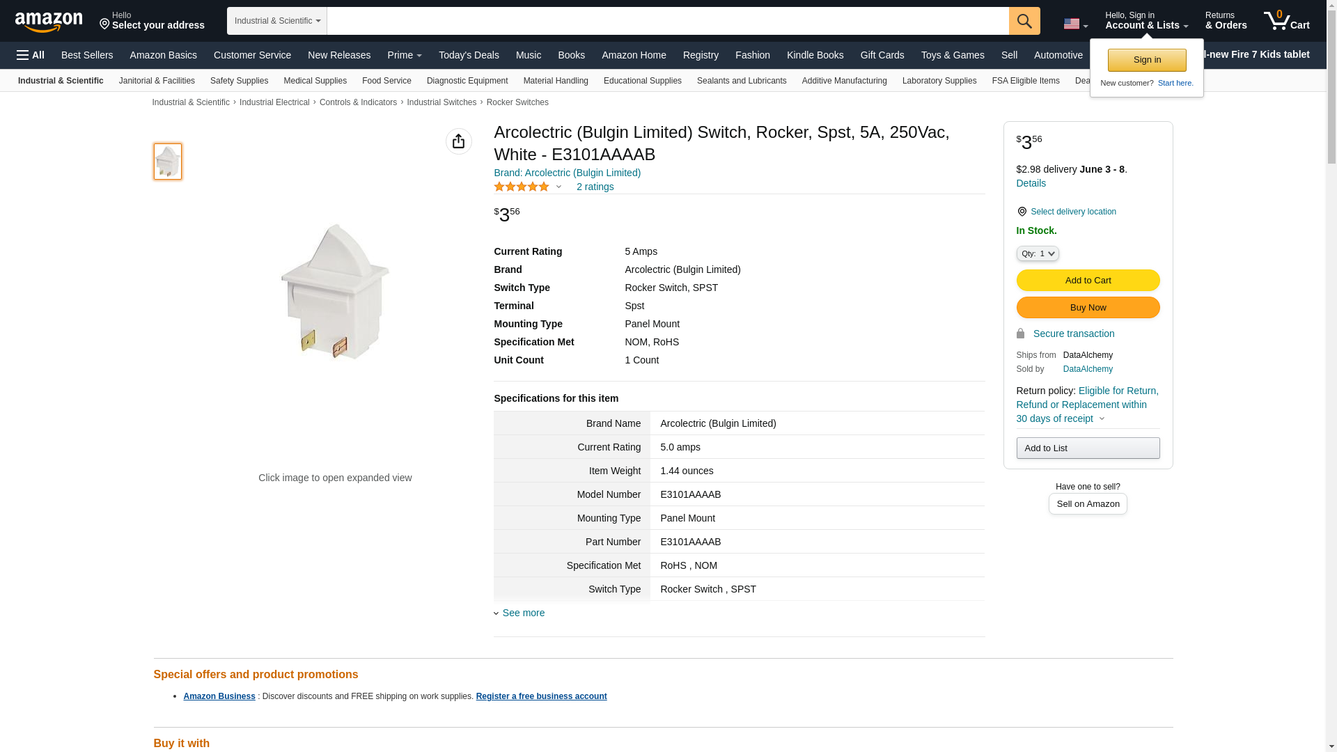 ARCOLECTRIC SWITCHES E3101AAAAB SWITCH, ROCKER, SPST, 5A, 250VAC, WHITE (50 pieces)