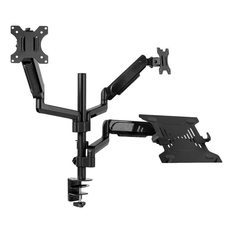 Increase efficiency and optimize viewing angles with the Pneumatic Arm Dual Monitor and Laptop Desk Mount (STAND-V003KL) from VIVO! Win back valuable desk space by elevating 2 monitors and a laptop to an ideal viewing height with this high-grade steel stand built for scratch resistance and security. Featuring screen articulation, pneumatic spring height adjustment, a sturdy C-clamp, integrated cable management, and more, this mount is customizable to your particular office needs. The versatility of screen placement allows ergonomic viewing that aids in decreased fatigue and muscle strain on the neck, back, and shoulders. The classy appearance adds a modern look to any office while providing ample support for 3 screens. All hardware is provided for easy assembly, so you can get your screens mounted in no time!