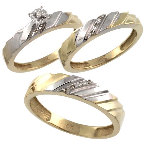 World Jewels 10K Gold Trio Diamond Wedding Ring Band Set, With 0.075 CT. Brilliant Cut Diamonds, Ladies Size 6.5