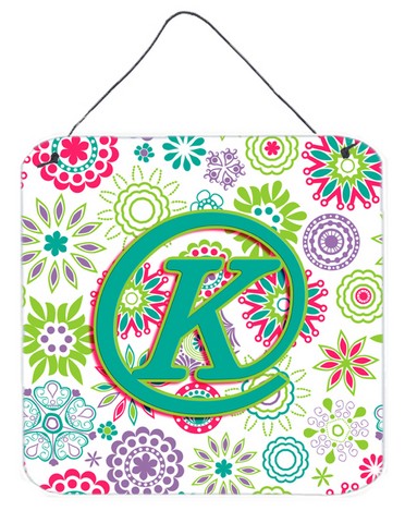 Caroline's Treasures CJ2011-KDS66 Letter K Flowers Pink Teal Green Initial Wall or Door Hanging Prints Aluminum Metal Sign Kitchen Wall Bar Bathroom Plaque Home Decor, 6x6, Multicolor