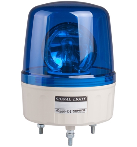 Menics AVGB-10-B 135mm beacon light is 110V AC with a blue lens. Stud mounting with an incandescent light. Rotates 150 times per minute. Has 80 dB alarm.