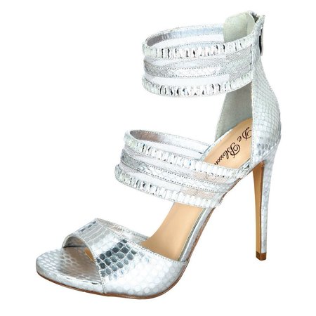 This stylish heel by De Blossom perfectly complements any evening attire. Get moving in the Angie-21. The stylish shoe in silver features a stunning 4.5" heel height and single sole concept with feminine mesh and frill details on its two upper straps. This shoe also boasts an adjustable zipper, ankle strap, and faux python detailing.
