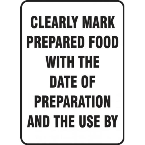 Safety Signs: Clearly Mark Prepared Food With The Date Of Preparation And The Use By, 14" x 10". Two-ply, poly-carbonate plastic with industrial-strength backing. Resists fading, chemicals, corrosion, abrasions, cracking, and chipping. Non-glare reverse and subsurface print encapsulated by permanently bonded embossed poly surface. <br>Rounded corners and 1/4" mounting holes on most sizes. Service temperature range: Poly-carbonate at -60 to 260 F; backing -40 to 176 F.<br><br>Accu-Shield is the highest performance sign material, with an extended 15-year outdoor durability guarantee. The non-glare polycarbonate plastic is specially formulated to resist color change, chemicals, corrosion, vandalism, and abrasions - and will continue to look good for years while maintaining its superior strength. The two-ply, heavy-duty construction provides a rugged yet stylish appearance.<br><br>The legend and message are reverse-printed with UV resistant inks on the underside of the clear polycarbonate. This sub-surface image is sealed with further protection on the backside by a permanently bonded, laminated poly sheet. A composite sign, .189" thick, will not crack, chip, fade, or become brittle under extreme environments. Use indoors and outdoors. with service temperature range for poly-carbonate at -60 degrees to 260 degrees F. and under layer surface -40 degrees to 176 degrees F.