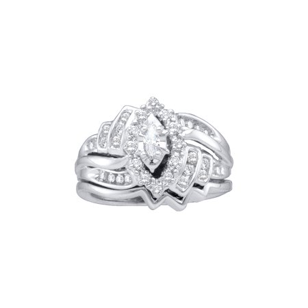 <p><span style="font-size:16px;"><b><u>Description</u></b><br /></span></p> <p><span style="font-size: 14px;">14kt White Gold Womens Marquise Diamond Bridal Wedding Engagement Ring Band Set 1/2 Cttw</span></p> <br /> <p><span style="font-size:16px"><u><b>Gemstone Details</b></u></span></p> <p><span style="font-size:14px">1/2 Carats total weight --- 1/12 carat center solitaire<br /><br />All diamonds are natural and conflict-free in origin<br /><br /></span></p> <ul type="square"> <b>Marquise Center Diamond</b> <br /> <li>1/12 ct.t.w.</li> <li>I1 clarity</li> <li>G-H color</li> <li>4-prong setting</li> </ul> <br /> <ul> <b>Round Diamond</b> <br /> <li>1/5 ct.t.w.</li> <li>I3 clarity</li> <li>G-H color</li> <li>Channel setting</li> </ul> <br /> <ul> <b>Round Diamond</b> <br /> <li>1/5 ct.t.w.</li> <li>I3 clarity</li> <li>G-H color</li> <li>Pave setting</li> </ul> <br /> <p><span style="font-size:16px"><u><b>Specifications</b></u><br /></span></p> <p><span style="font-size:14px">14kt White Gold<br />8.6 grams (approximately)<br />Ring size selectable</span></p> <p><span style="font-size:11px">Combined diamond weight of 1/2 carats total weight represents a range of 0.46 - 0.58 cts. t.w.</span></p>