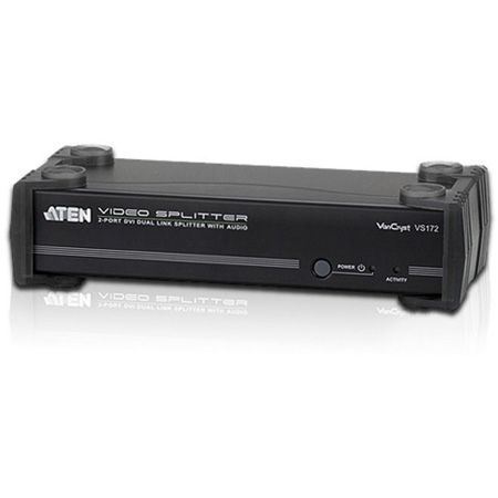 The VS172 2-Port DVI Dual Link Splitter with Audio combines DVI quality video and audio, taking signals from an audio/ video source and replicating them to two audio/video outputs. This video splitter uses dual link technology, which offers high bandwidth capacity for added transmission power and faster refresh rates, thereby providing better video quality of viewing resolutions up to 2560 x 1600.</p><p>The built-in bi-directional RS-232 port on the rear panel allows the splitter to be controlled through a Control Unit, PC, and/or home automation/home theater software package for complete system integration.</p><p>The VS172 is easy to operate and can be cascaded to three levels, handling up to 8 monitors, which makes them the ideal solution for situations such as:<br />a) Broadcasting video information to the public (news headlines,stock prices, airline and train schedules, etc.)<br />b) Company training facilities<br />c) Classroom instruction</p>