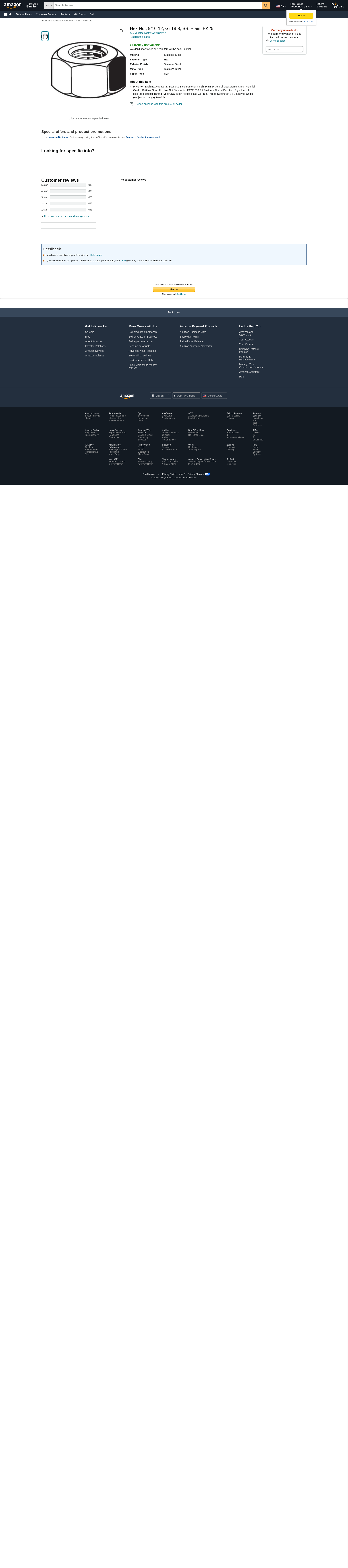 - Price For: Each Basic Material: Stainless Steel Fastener Finish: Plain System of Measurement: Inch Material Grade: 18-8 Nut Style: Hex Nut Nut Standards: ASME B18.2.2 Fastener Thread Direction: Right Hand Item: Hex Nut Fastener Thread Type: UNC Width Across Flats: 7/8" Dia./Thread Size: 9/16"-12 Country of Origin (subject to change): Multiple