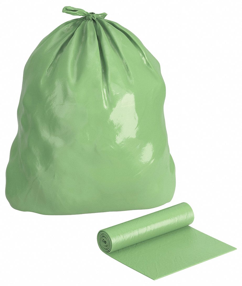 'Trash Bag, Fits Container Capacity 32 gal., Capacity 33 gal., Trash Bag Material Linear Low Density Polyethylene (LLDPE), Percent Recycled Content 0 Percent, Thickness 1.10 mil, Color Green, Bag Closure Type None, Width 33 In., Height 40 In., Max. Load 55 lb., Bottom Seal Type Star, Scent Unscented, Legend No Legend, Package Configuration Coreless Roll, Bags Per Roll 20, Item Trash Bags, Package Quantity 40'