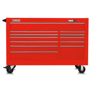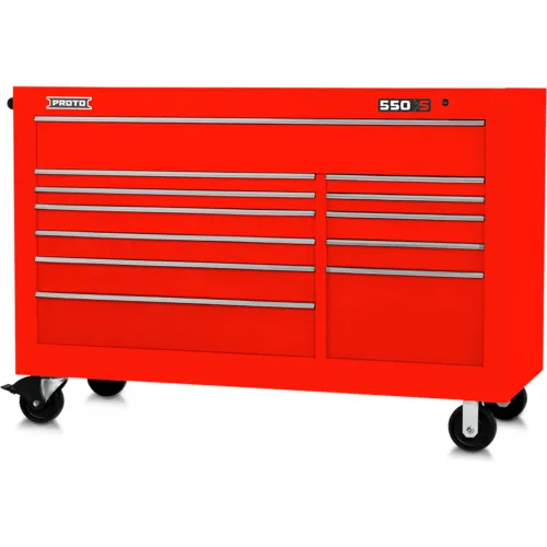 Technical Specification Item Workstation Series 550S Width 66" Depth 27" Height 46" Number of Drawers 12 Color Red Drawer Capacity 400 lb. Drawer Slides Ball Bearing, Full Extension Storage Capacity 36, 455 cu in. Load Rating 3600 lb. Caster Size 6" x 2" Number of Shelves 0 Material Steel Gauge Bottom: 14, Side: 16, Drawers: 18 Work Surface Material Steel/Vinyl Caster Wheel Material Glass Filled Nylon Caster Type (2) Fixed with Lock, (2) Swivel Locking System Heavy Duty Locks with Tubular Keys Handles Ergonomic Metal Side Configuration Center Bank: (1) 59" W x 24-3/4" D x 6" H, Left Bank: (2) 37-3/8" W x 24-3/4" D x 1-3/4" H, (2) 37-3/8" W x 24-3/4" D x 3" H, (1) 37-3/8" W x 24-3/4" D x 4" H, (1) 37-3/8" W x 24-3/4" D x 6" H, Right Bank: (2) 18-43/64" W x 24-3/4" D x 1-3/4" H, (2) 18-43/64" W x 24-3/4" D x 3" H, (1) 18-43/64" W x 24-3/4" D x 11" H Finish Gloss Features Brushed Aluminum Drawer Pulls, Fully Extending and Recessed Drawers, Adjustable Drawer Detents, Reinforced Top and Bottom Panels For Use With Proto 550 Series Includes Drawer Liners This listing is for each.