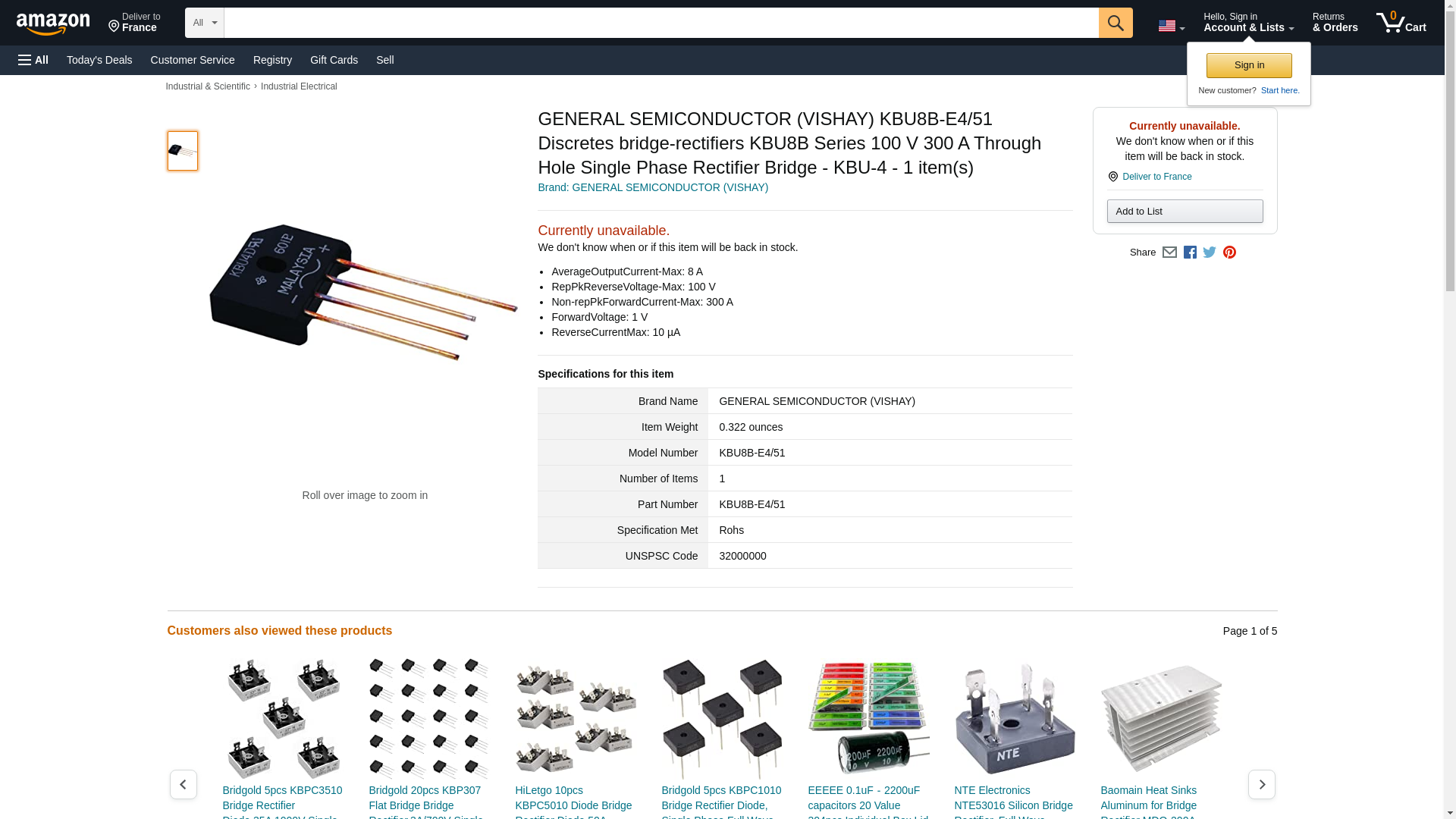 GENERAL SEMICONDUCTOR (VISHAY) KBU8B-E4/51 Discretes bridge-rectifiers KBU8B Series 100 V 300 A Through Hole Single Phase Rectifier Bridge - KBU-4 - 1 item(s)