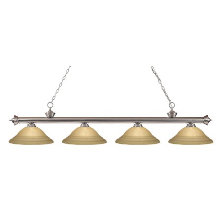 The slim styling of this four light fixture creates a classic yet modern statement. Finished in brushed nickel, this four light fixture uses warm golden swirl glass shades to compliment its classic look <br /> <br /> <ul> <li>Color: Golden swirl</li> <li>Cord length: 120 inches</li> <li>Setting: Indoor</li> <li>Fixture finish: Nickel </li> <li>Number of lights: Four (4)</li> <li>Required wattage: 100 watt </li> <li>Line switch</li> <li>Dimensions: 72 to 82 inches high x 16 inches wide x 15 inches deep </li> </ul> <br /> <b><i>This fixture does need to be hard wired. Professional installation is recommended.</i></b> <br />