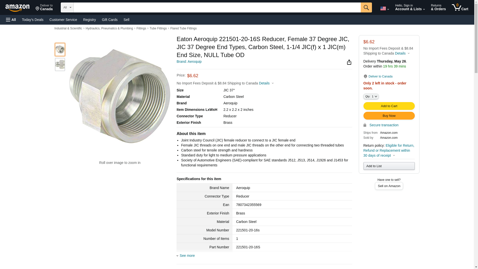 Eaton Aeroquip 221501-20-16S Reducer, Female 37 Degree JIC, JIC 37 Degree End Types, Carbon Steel, 1-1/4 JIC(f) x 1 JIC(m) End Size, NULL Tube OD
