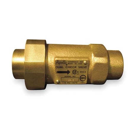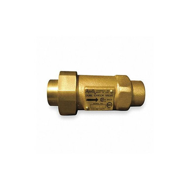 'Dual Check Valve, Material of Construction Bronze, Size 1 In., Connection Type FNPT, Length 4-3/8 In., Width 1-1/2 In., Overall Height 2 In., Max. Water Pressure 175 psi, Cracking Pressure 2 psi, Max. Temp. 180 Degrees F, Mounting Position Horizontal, Seat Material Buna N, Spring Material Stainless Steel, Hex Size 1 In., Standards ASSE 1024, Compliance ASSE 1024, CSA B64.6'