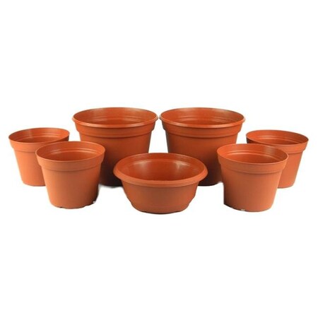 Decorate your home deck patio or porch with this 4 TEKU plastic decorative round pot and bowl set Two 8 Inch round at the top and 6 Inches deep TO21 and four 6 inch round 45 inches deep To15 and one 725 inch wide 35 inch deep T20 bowl These planters are durable weather proof and are wonderful for all plants Rapid growth and healthier plants due to ideal irrigation and drainage Features. Very low failure rates. Extensive use of recycled material. Easy stacking when not in use. Reduced cultivation time. Level with sloped drainage openingsIncludes. 7 variety sized plastic potsSpecifications. Finish Terra Cotta. Size 6 to 8. Material Plastic. Style MediterraneanSouthwestern. Container Size Small. Container Volume 199 Quarts. Dimension 7 H x 8 W x 8 L. Weight 3 lbs