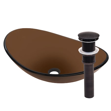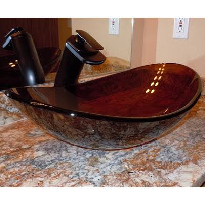 - Clear brown glass oval slipper vessel sink with oil rubbed bronze hardware